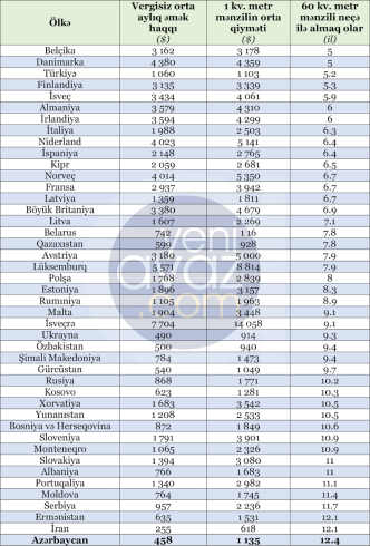 Cədvəldə Avropa, keçmiş SSRİ və qonşu ölkələr arasında vergilər və digər sosial ödənişlər çıxıldıqdan sonra orta aylıq əməkhaqqı, şəhərin kənar rayonlarında yerləşən mənzillərin bir kv. metrinin orta satış qiyməti və 60 kv. metr mənzili ala bilmək üçün orta aylıq əməkhaqqını neçə il toplamaq lazım olduğu göstərilib: