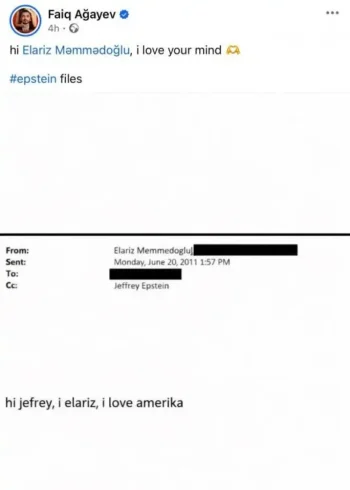 Xalq artisti Faiq Ağayev hazırda Amerikada yaşayan müğənni Elariz Məmmədoğlu ilə bağlı paylaşım edib. SAVASHMEDİA.az xəbər verir ki,paylaşımda Elarizin onlarla azyaşlı qızın istismar edildiyi şəbəkə ilə bağlı ittiham olunan milyarder Ceffri Epşteynə yazdığı elektron məktub yer alıb. Məktub 2011-ci ilə aid olub.