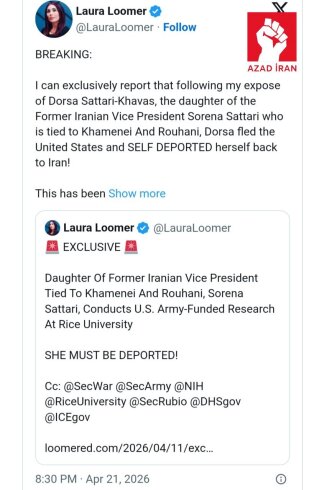 "X"-də Lara Lumer iddia edib ki, İranın keçmiş vitse-prezidenti Sorena Səttarinin qızı Dorsa Səttari Xasın kimliyini açıqladıqdan sonra bu şəxs ABŞ-ni tərk edərək "öz istəyi ilə" İrana qayıdıb. Lumer deyir ki, bunu ABŞ Daxili Təhlükəsizlik Departamentindəki "yüksək vəzifəli mənbə" ona təsdiqləyib və mənbəyə görə, Dorsanın bir daha ABŞ-yə girişinə icazə verilməyəcək. "Azad İran" teleqram kanalı