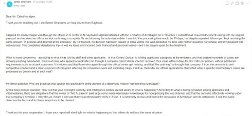İraqın sadə vətəndaşları da səfirliyin yaratdığı “viza monopoliyası”ndan əziyyət çəkirlər. Onlardan biri də Samer Faisal Abdulsaheb Smaysemdir. O, viza üçün müraciət etdiyi Azərbaycan səfirliyinin davranışından çox narazı qalıb.