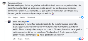 Nazir şərhlə yanaşı, ona ünvanlanan mesajları da cavabsız qoymayıb. Belə ki, sosial şəbəkə istifadəçilərindən biri bunun heç də fəxr ediləsi hal olmadığını deyib: “İnsan ömrü yollarda heç olur, qaranlıqda yola düşür və gec qayıdır. Bu hardasa gənc qız üçün təhlükəli də ola bilər. Xankəndidə 2-3 gün qalması üçün şərait yaratmaqdansa, insanın çəkdiyi lazımsız əziyyətə təşəkkür edirsiniz”.
