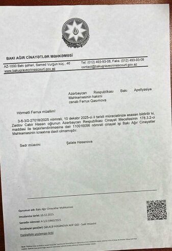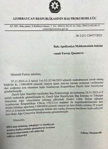 Daxili İşlər Nazirliyi tərəfindən Baş Prokurorluğa ünvanlanmış 24.11.2025-ci il tarixli məktubda göstərilmişdir ki, Daxili İşlər Nazirliyinin Baş İstintaq və Təhqiqat İdarəsinin Ağır cinayətlərin istintaqı şöbəsində Zaidov Cabir Həsən oğlunun Azərbaycan Respublikası CM-in 178.3.2-ci maddəsi ilə təqsirləndirilməsinə dair ibtidai istintaqı aparılmış 110016056 nömrəli cinayət işi üzrə ibtidai istintaq 29 avqust 2012-ci il tarixdə tamamlanmaqla ittiham aktı təsdiq olunaraq baxılması üçün aidiyyəti üzrə Bakı Ağır Cinayətlər Məhkəməsinə göndərilmişdir.
