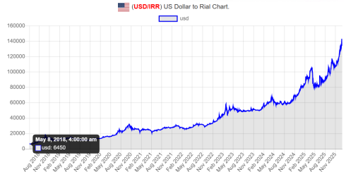 Pəhləvi rejiminə qarşı istifadə ilə populyarlaşmış, klassik “Mərg bər diktator” (“Diktatora ölüm”) şüarı ilə yanaşı işlənən indiki şüarlara baxdığımızda onların açıq iqtisadi tələblərə əsaslandığını görmək olar. İranın rəsmi valyutası rialın ABŞ dolları ilə müqayisədə real mübadilə dəyərinin son 8 ildəki göstəricilərinə baxsaq, onun 21 dəfədən çox dəyər itirdiyini müşahidə edə bilərik (Qrafik 1). Rialın İran bazarındakı həqiqi dəyərini göstərən “Bonbast” portalına nəzər yetirdiyimizdə görərik ki, əgər 2018-ci ilin mayın 8-də 1 ABŞ dolları 64 500 rial təşkil edirdisə, hazırda bu göstərici 1350500-dür (Bonbast 2026).