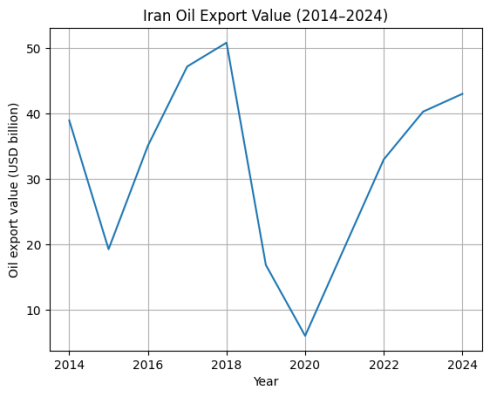 Müqayisə üçün 8 may 2018-ci il tarixini seçməyimiz təsadüfi deyil. Belə ki, məhz həmin ərəfədə ABŞ birtərəfli qaydada İranın nüvə proqramının müzakirə olunduğu diplomatik çərçivəni - Birgə Hərtərəfli Fəaliyyət Planını (BHFP) tərk etdiyini açıqladı və İrana qarşı “maksimum təzyiq” kampaniyasına başladı (Aksüt 2020). 7 avqust 2018-ci ildə sanksiya paketinin birinci mərhələsi həyata keçirildi: İranın dəyərli metallar və qızıl ticarəti, nəqliyyat vasitələri sektoru, İran rialı ilə həyata keçirilən tranzaksiyalar hədəfə alındı. Paketin ikinci mərhələsi isə 5 noyabr 2018-ci ildə qüvvəyə mindi: Zərbə enerji və neft sektoru, dəniz yolu ilə daşmalara və bank sektoruna dəydi (Hannah 2021). Neft sektoruna tətbiq olunan sanksiyalar dərhal effekt verdi. 2018-ci ilin əvvəllərində həcmi təqribən 50.82 milyard ABŞ dolları olan İran neft ixracı 1 ildə dramatik şəkildə təqribən 16.85 milyarda, iki ildə isə 6.01 milyarda düşdü (TradeIMEX 2025) (Qrafik 2).