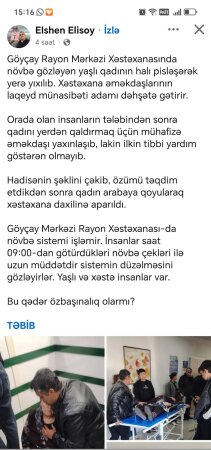 Tribuna.az xəbər verir ki, bunu Elşən Əlisoy adlı şəxs sosial şəbəkə hesabında yazıb. O bildirib ki, xəstəxana əməkdaşlarının laqeyd münasibəti adamı dəhşətə gətirir: