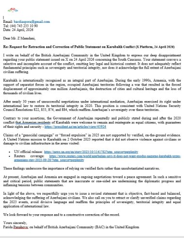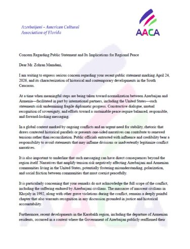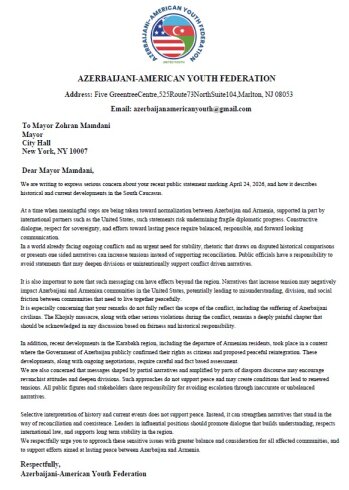 Məktublarda Nyu-York merinin Azərbaycan xalqına qarşı səsləndirdiyi ittihamlarla bağlı ciddi narahatlıq ifadə edilib. Zöhran Kvame Mamdaninin açıqlamasında siyasi qərəz olduğu, eyni zamanda beynəlxalq hüququn əsas prinsiplərinin təhrif edildiyi vurğulanıb. ABŞ-nin Azərbaycan və Ermənistan arasında sülh sazişini dəstəklədiyi, münasibətlərin normallaşdırılması istiqamətində mühüm addımların atıldığı bir dövrdə bu cür qərəzli yanaşmaların yolverilməz olduğu bildirilib. Qarabağ bölgəsində yaşayan erməni əsilli əhaliyə reinteqrasiya çərçivəsində bərabər hüquqların və təhlükəsizlik təminatlarının təklif olunduğu, onların sosial-iqtisadi həyata inteqrasiyası üçün konkret addımların atıldığı diqqətə çatdırılıb. Xüsusi olaraq qeyd edilib ki, mülki şəxslərə qarşı etnik zəmində hər hansı zorakılıq faktı qeydə alınmayıb və bu istiqamətdə beynəlxalq hüququn prinsiplərinə uyğun davranılıb.