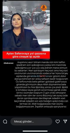 Globalinfo.az xəbər verir ki, bu sözləri ötən ilin aprel ayında aparıcı Aytən Səfərovanın idarə etdiyi “Hyundai” markalı avtomobillə digər minik avtomobilinin toqquşması nəticəsində həyatını itirən Ayxan Əliyevin qardaşı Altun Əliyev yazıb.