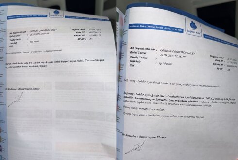 "Xahiş edirəm ki, bu barədə tədbir görülsün. Hazırda ekspertizadan keçmişəm, ordan da xəstəxanaya gedib, müayinə olundum. Burnumda qırıq, ayağımda isə çat var. Ağrılarım getdikcə artır. Həmin gün çox şeyi hiss etməmişdim. Burnum sınıb, gözümün ətrafı göyərib, iki dişim sınıb, yerə yıxıldığıma görə topuğum çatlayıb, bundan başqa böyrək nahiyəmdə ağrı hiss edirəm.