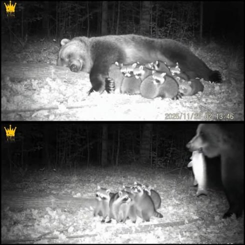Təhlükəsizlik kamerası bir ayının bir yenot ailəsini "övladlığa götürdüyünü" çəkib.