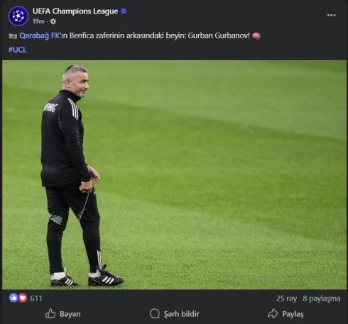 Çempionlar Liqasının rəsmi səhifəsində Qurban Qurbanovla bağlı - Paylaşım 18-09-2025, 10:14 UEFA Çempionlar Liqasının rəsmi feysbuk səhifəsi "Qarabağ”ın baş məşqçisi Qurban Qurbanovla bağlı paylaşım edib."Qafqazinfo” xəbər verir ki, rəsmi səhifədə təcrübəli mütəxəssisin fotosu paylaşılaraq bu sözlər yazılıb:"Qarabağ”ın "Benfica” zəfərinin arxasındakı beyin: Qurban Qurbanov!”Qeyd edək ki, ötən gün "Qarabağ” "Benfika”ni səfərdə 3:2 hesabı ilə məğlub edib. Facebook-da paylaş