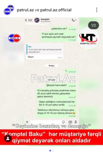 Sabahı gün isə müştəri mağazaya yenidən müraciət edərək, eyni “iPhone 17 Pro” üçün endirimlə təklif olunan anti-udar ekran qoruyucunun qiymətini soruşub.Müştəri həmçinin WhatsApp üzərindən mağazaya yazaraq qiymət soruşub və ona antiudarın 15 AZN qiymət verilib.