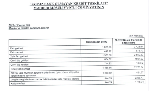 Bu dəfə isə 32gun.az xəbər verir ki, “Kəpəz” Bank Olmayan Kredit Təşkilatının açıqladığı 2025-ci ilin I yarımillik maliyyə nəticələrini araşdırıb.
