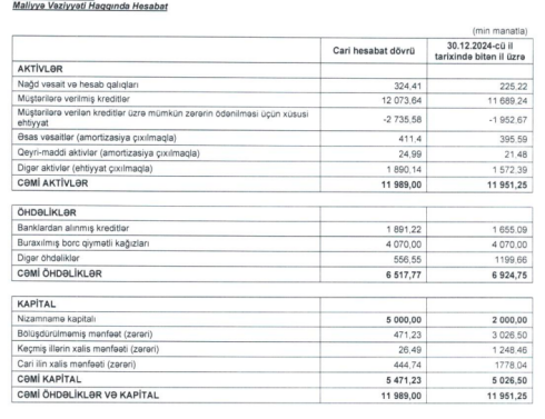 Nağd vəsait 324 min manatla məhdudlaşıb. Banklardan alınmış kreditlər 1 891 min manat, buraxılmış borc qiymətli kağızları 4 070 min manat, digər öhdəliklər isə 556 min manatdır. Ümumi öhdəliklərin 6 517 min manat olması kapitalın dayanıqlığını ciddi şəkildə sınayır.