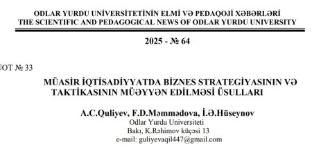 “Müasir iqtisadiyyatda biznes strategiyasinin və taktikasinin müəyyən edilməsi üsullari” adı ilə məqalə təqdim edilib.Məqalənin ədəbiyyat siyahısında son üç ilin nə yerli nə də xarici bir dənə elmi ədəbiyyatı yoxdur. Bütün ədəbiyyatlar 15-20 il əvvələ aiddir. Bu məqaləyə rəyi kim verib? Ortaya çıxıb bunu ictimaiyyətə izah etməlidir ki, bu məqaləyə nə üçün gözlərini yumub, rəy verib?