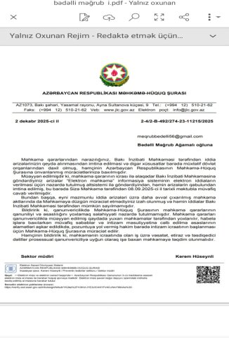 tələbkarln verdiyi ərizələrin qəbulundan imtina olunmasından şikayətlərə 02.12.2025-ci ildə baxıldığını bildirib. Və “müəyyən edib” ki, MƏHKƏMƏ QƏRARININ İCRASI İLƏ