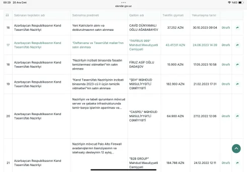 “PAPİRUS 999” MMC – 43.417,01 AZN məbləğində dəftərxana və təsərrüfat mallarının alışı.