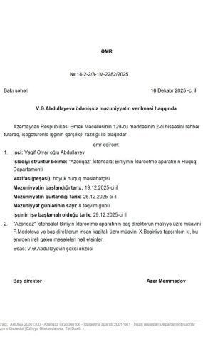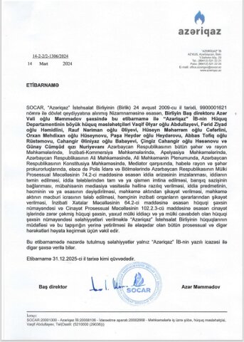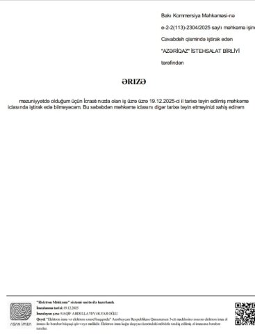 İş Nizami məhkəməsindən “aidiyyatı” Bakı Kommersiya Məhkəməsinə göndərilib və eyni hakimin (Günay Namazova) icraatına verilib. Cavabdeh “Azəriqaz” ın bu məhkəmədə “oyun havaları” süründürməçiliyə yeni meydan verib. Məhkəmə işi aidiyyatı üzrə ümumi məhkəməyə qaytarmaq əvəzinə həftədə bir dəfə hazırlıq iclası təyin edir. Süründürməçilik iclaslarına “qazı” cavabdeh “Azəriqaz” vurur”. “Azəriqaz”ın rəhbərinin “topdan” 10 nəfəri 1-ci dərəcəli Qarabağ qazisinə qarşı VƏKİL (?- yalnız VK üzvləri bu addan yararlana bilər, başqasının vəkil adından istifadəsi 800 manat cəriməyə səbəb olur) etdiyi işçilərindən Vaqif Abdullayev 19.12.2025-ci ilə təyin olunan hazırlıq iclasının ödənişsiz məzuniyyətdə olması səbəbindən növbəti ilə- 08.01.2026-cı ilə keçirilməsinə nail olub. Məhkəmənin “qaz havası”na qol götürüb oynamağına” baxın, “Azəriqaz” İB-nin baş direktoru Azər Məmmədov 16.12. 2025-ci il tarixli əmrlə Vaqif Abdullayevi 19.12.2025-ci ildən (?-ikinci iclas bu tarixə təyin olunub) ödənişsiz məzuniyyətə göndərib və onun məhkəməyə məzuniyyətini pozmamaq ərizəsini hakim təmin edib. (?) Bəyəm 10 nəfər vəkil ediləndən yalnız Vaqif Abdullayevın iştirakı məcburidir, başqası məhkəməyə sifarişi yerinə yetirə bilməz? Açıq-aşkar məhkəməyə hörmətsizlik, süründürməçilik göz önündə olsa da, məhkəmə nə süründürməçiliyə son qoyur, nə işin aidiyyatının pozuntusuna. Heç bir il qabaq 19.12.2024-cü il tarixli aktla Nizami məhkəməsinin 1-ci dərəcəli Qarabağ əlilinə 6 saylı vəkil bürosundan ayırdığı vəkilin xidmətdən imtinasına da qiymət verən yoxdur.
