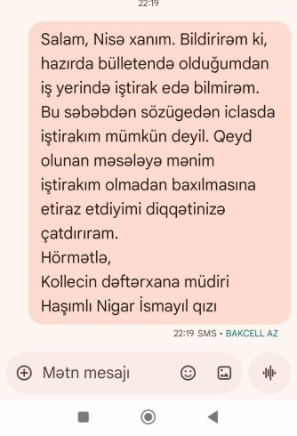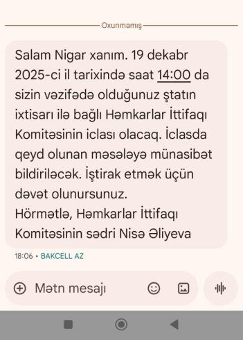 Hazırda direktor, bütün bu təzyiqlərə baxmayaraq işdən çıxmadığımı görərək, çalışdığım ştat vahidinin ləğv edilməsi təşəbbüsü ilə çıxış edir. Kollecin Həmkarlar İttifaqının sədri Nisə Əliyeva, mən xəstəlik vərəqəsində (bülleten) olduğum müddətdə mənə mesaj yazaraq, ştatın ləğv ediləcəyi ilə bağlı iclas keçiriləcəyini bildirmişdir. Təəssüf doğuran haldır ki, həmkarlar ittifaqı işçinin deyil, rəhbərliyin maraqlarını müdafiə edən mövqe sərgiləyir.