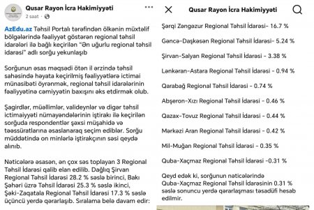 Bu gün Qusar Rayon İcra Hakimiyyətinin rəsmi sosial şəbəkə səhifəsində AzEdu.az Təhsil Portalı tərəfindən keçirilmiş “Ən uğurlu regional təhsil idarəsi” adlı sorğunun nəticələri paylaşılıb. Sorğunun nəticələrinə əsasən Quba-Xaçmaz Regional Təhsil İdarəsi 0.31 faiz səs toplayaraq siyahıda sonuncu yerdə qərarlaşıb.
