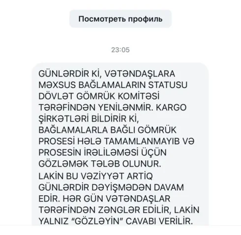 Günlərdir, vətəndaşlar onlara məxsus xaricdən gələn bağlamalar haqqında məlumat əldə etmədiklərini iddia edirlər. Ajans.az-a daxil olan şikayətdə bildirilib ki, bağlamaların statusu Dövlət Gömrük Komitəsi tərəfindən yenilənmir.