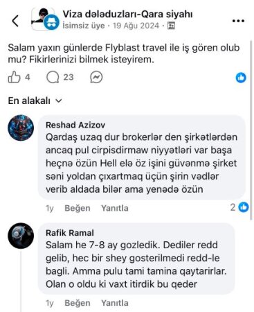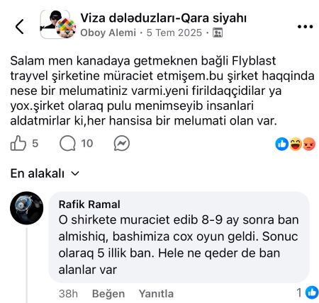 AzFakt.com xəbər verir ki, sosial şəbəkələrdə vətəndaşların şikayətlərində qeyd olunur ki, Flyblast Travel Agency ilə müqavilə bağlayan şəxslər aylarla hətta illərlə süründürməçiliyə məruz qalır, proseslər süni şəkildə uzadılır və nəticədə bir çox hallarda viza alınmır. Bu isə ödəniş edilmiş xidmətin faktiki göstərilməməsi kimi qiymətləndirilir.