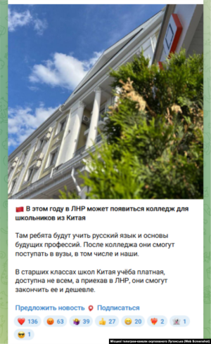 Сообщение об открытии китайского колледжа на 300 учеников начало появляться в российских СМИ, после чего его распространяли местные телеграм-каналы. Риторика такова: "Иностранцы будут изучать русский язык и основы будущих профессий, а затем смогут поступить в российские вузы". Китайцы вроде бы даже уже ищут соответствующее помещение и регистрируют юридическое лицо в Луганской области. Правда, по какому законодательству они это делают, непонятно.
