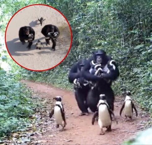 Попытка шимпанзе одомашнить пингвинов в бассейне Конго.
