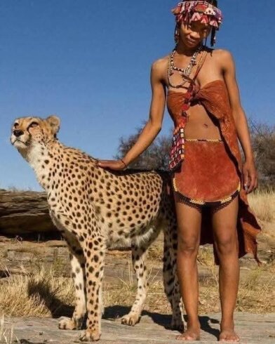 Девушка племени Сан (старейшей живой культуры на земле) с прирученным гепардом
