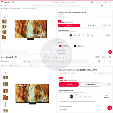 “Kontakt Home”un başqa bir məhsulu – “Samsung QE55QN70FAUXRU” markalı televizor Gürcüstan alıcıları üçün 874 dollara (2 350 lari), Azərbaycan alıcılarına isə 1 412 dollara (2 340 manat) təklif olunur.