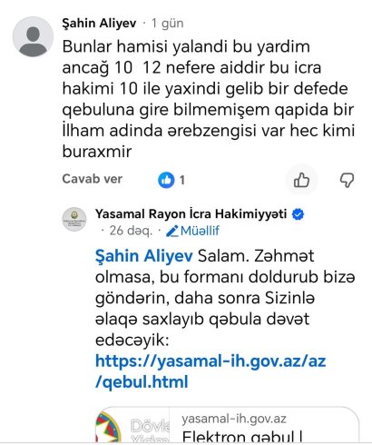 “Bunlar hamısı yalandı. Bu yardım ancaq 10-12 nəfərə aiddir. Bu icra hakimi 10 ilə yaxındı gəlib, bir dəfə də qəbuluna girə bilməmişəm. Qapıda bir İlham adında ərəbzəngisi var, heç kimi buraxmır”.