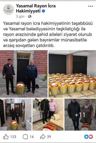 Vətəndaş Yasamal rayon icra hakimiyyətinin təşəbbüsü və Yasamal bələdiyyəsinin təşkilatçılığı ilə rayon ərazisində yaşayan şəhid ailələrinə bayramlar münasibətilə ərzaq sovqatları çatdırılmasının yalan olduğunu bildirib.