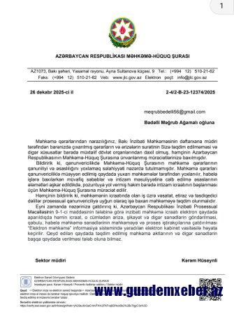 Məhkəməyə hansı yolla daxil olmasından asılı olmayaraq ərizələrin qəbulundan imtina edilməsi, qeydə alınmayıb gizlədilməsi cinayət xarakterli hərəkətdir və bu hərəkət məhkəmə sədrinin razılığı və birbaşa göstərişi olmadan edilə bilməz! Bakı İnzibati Məhkəməsinin sədrinin borclu ƏƏSMN-in rüşvət sifarişini Konstitusiyadan üstün tutmasından MHŞ-ya (çoxillik) şikayətlərə “baxan” sektor müdiri Kərəm Hüseynli öncə eleltron kabinetin yalnız iddia ərizələrinin verilməsi üçün nəzərdə tutulduğunu BİM-ə istinadla vurğulayıb. “Elektron məhkəmə” sisteminin tətbiqini MHŞ-nın həyata keçirdiyini diqqətə çatdıranda isə 26.12.2025-ci il tarixli məktubla sektor müdiri şikayəti “Bakı İnzibati Məhkəməsinin dəftərxana müdiri tərəfindən barənizdə çıxarılmış qərarların və ərizələrin surətlərinin Sizə təqdim edilməməsindən” müraciət şəklində saxtalaşdırıb. Axı tələbkar şikayətində barəsində çıxarılmış qərarların və ərizələrin surətinin təqdim edilməməsindən yox, məhkəməyə təqdim etdiyi ərizələrin qəbul edilməməsindən, qeydə alınmamasından, icraya qadağa qoyulmasından şikayət edir! Özü də bu özbaşınalığın məhkəmə sədrinin göstərişi ilə edildiyini vurğulayır. MHŞ hansı əsasla və səlahiyyətlə şikayəti saxtalaşdırır? Bəlkə Bakı İnzibati Məhkəməsinin sədri dəftərxana müdiri təyin olunub, ya hər iki vəzifəni tutur? İstənilən haıda, şikayətin əsasını məhkəməyə müraciətə, məhkəmə qərarının icrasına qadağa qoyulması təşkil edir. Məhkəməyə müraciətə , məhkəmə qərarlarının icrasına qadağa Konstitusiyaya qadağa olduğundan nə BİM sədri və dəftərxana müdirinin, nə MHŞ-nın sektor müdirinin , heç kəsin gücündə deyil. Necə deyərlər, qüvvə Konstitusiyadadır, başqa heç bir qüvvə, güc Konstitusiyadan üstün ola bilməz.
