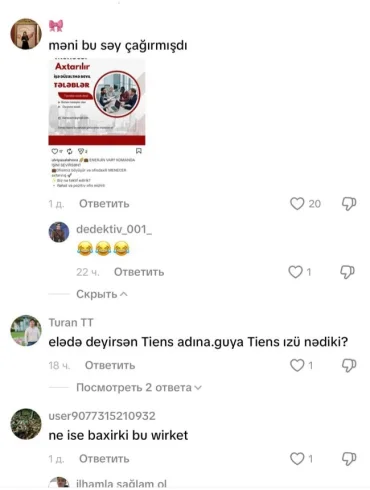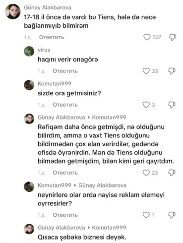 Yayılan videolardan birində göstərilib ki, bir qrup insan iş müsahibəsi adı ilə TİENS-ə dəvət edilib, lakin sonradan onlara konkret iş təklifi verilməyib və aldadıldıqları məlum olub.