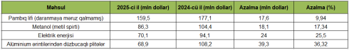 2025-ci ilin yanvar-dekabr aylarında əsas qeyri-neft malları üzrə ixracda azalma qeydə alınıb.