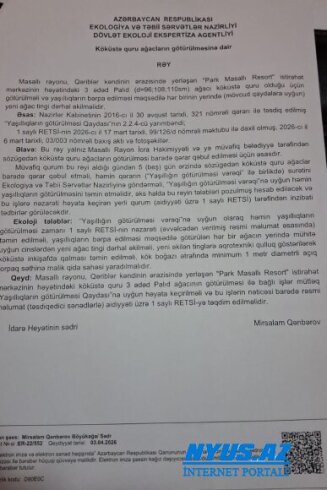 Masallı sakinlərinin "Nyus.Az" xəbər saytına verdiyi məlumata görə, 11 saylı Regional Meşə Təsərrüfatı Mərkəzinin Qəriblər meşəbəyliyinin 8 saylı dolayında "Park Masallı" adlanan ərazidə 2025-ci ildən elə oranın sahibi tərəfindən qurudulmağa başlamış 3 iridiametirli (96 sm, 108 sm, 110 sm) şabalıdyarpaq palıd ağacının kəsilməsi üçün saxta rəy alınlb və 3 ağacın 3 də 20.04.2026 ci il tarixdə kəsilərək götürülmüşdür.