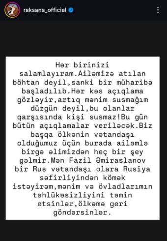 “Hər birinizi salamlayıram. Ailəmizə atılan böhtan deyil, sanki bir müharibə başladılıb. Hər kəs açıqlama gözləyir, artıq mənim susmağım düzgün deyil, bu olanlar qarşısında kişi susmaz! Bu gün bütün açıqlamalar veriləcək. Biz başqa ölkənin vətəndaşı olduğumuz üçün burada ailəmlə birgə əlimizdən heç bir şey gəlmir. Mən Fazil Əmiraslanov bir rus vətəndaşı olaraq Rusiya səfirliyindən kömək istəyirəm. Mənim və övladlarımın təhlükəsizliyini təmin etsinlər, ölkəmə geri göndərsinlər.