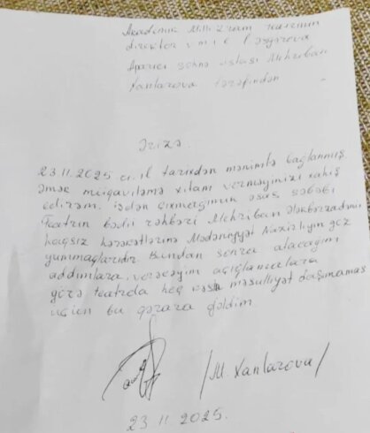 “Bildirmək istəyirəm ki, mən və digər həmkarlarımın uzun müddət mətbuatda susmağımızın səbəbi vəzifəli şəxslərin bizə verdiyi söz idi: “Mehriban Ələkbərzadənin müqaviləsi 15 noyabrda bitəcək və yeni müqavilə imzalanmayacaq. Xahiş edirik, mövzuya qayıtmayın.” Biz də bu sözə inanaraq gözlədik. Lakin məlum oldu ki, Mehriban Ələkbərzadə onun arxasında dayanan yüksək vəzifəli rəfiqəsinin dəstəyi ilə, nazir Adil Kərimlinin bütün özbaşınalıqlara göz yumması nəticəsində daha 6 ay vəzifəsində saxlanılıb.Mən, Respublikanın Əməkdar artisti Mehriban Xanlarova olaraq bildirirəm ki, Mehriban Ələkbərzadənin kollektivimizi alçaltması, şəhid qızına və onun ailəsinə ünvanladığı söyüşlər, 20 Yanvar şəhidlərinin xatirəsini “dəbdən düşmüş” adlandırması, erməni heykəlini səhnədə təbliğ etməsi, həmçinin İkinci Qarabağ müharibəsindən 5 il keçməsinə baxmayaraq ölkənin ana teatrında 44 günlük Vətən Müharibəsinin müqəddəs xatirəsinə bircə saatlıq belə sənət əsəri yaratmamasını, əvəzində teatrın baş rejissoru olaraq “AzDrama” üçün deyil, başqa bir dövlət qurumu AzTV üçün, pul müqabilində “sənədli film” adı altında xronologiya hazırlamasını, şəhid qanı ilə sulanmış torpaqlarda əli cibində, motivə və ruhuna uyğun olmayan geyimlə kamera qarşısında “stand-up” etməsini rüsvayçılıq hesab edirəm. “AzDrama”nın baş rejissoru başqa qurum üçün çalışmalıdımı? Teatra ayrılan vaxt, əməkhaqqı və status niyə başqa yerə sərf edilir? Bu özbaşınalıqların sonu görünmür.Mədəniyyət Nazirliyi ilə bağlı bildiyim faktları açıqlayacağım üçün işdən çıxarılmağı gözə alıb ərizə yazmışam. Çünki söz azadlığıma məhdudiyyət qoyulmasına razı deyildim.Cənab Nazir Adil Kərimli, saysız-hesabsız şikayətlərə baxmayaraq, öz imzanızla təyin etdiyiniz Mehriban Ələkbərzadəni vəzifədən azad etməyə əliniz əsdi. Çünki teatr camiəsi və incəsənət adamları kulislərdə danışır ki, Adil Kərimli məhz Fərəh Əliyevadan qorxduğu üçün Mehriban Ələkbərzadəni vəzifəsindən azad etmir.İnanıram ki, bir otaqlı evdə böyük ailə saxlayan və əlilliyi olan ailə üzvünə baxan mən, Mehriban Xanlarovanı işdən çıxarmağa bu dəfə əliniz əsəməyəcək. Çünki arxamda yalnız Allah dayanır və mən göydə Allaha, yerdə Cənab Prezident İlham Əliyevə güvənirəm.”