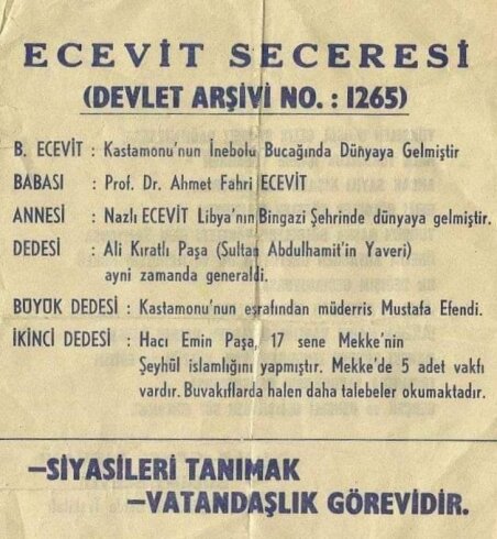 1979 yılında Sadık Albayrak (Berat Albayrak'ın babası) Ecevit ailesinin şeceresini çıkararak sağ basını şaşırtacaktı. Buna göre Bülent Ecevit'in baba tarafından dedesi Dadaylı Mustafa Şükrü Efendi, ulemadan, "sarıklı" bir zattı. Ramazan aylarında II. Abdülhamid'in huzurunda ders dinleyen ve ders veren bir müderris, bir "huzur hocası" idi. Sülalelerine "Kürtzade" derlerdi çünkü Osmanlı'nın iskan politikasıyla doğu illerinden Kastamonu'ya yerleştirilmişlerdi. Sadık Albayrak "medreseli" dede ile "Amerikan Robert Kolejli" torun arasındaki "derin uçurumun" altını çizmek istiyordu, ama onun "uçurum" dediğine bir başkası "köprü" de diyebilirdi.. 1960'lı yıllardan itibaren Bülent Ecevit'in belli ölçüde Kemal Tahir'in devlet ve tarih tezleriyle etkileşim içinde olduğu pek çok araştırmacının dikkatini çekecekti. Ecevit, 1973 seçim kampanyası sırasında, "Halk yıllarca ezile ezile gerçeği öğrenmeye başladı, CHP de yenile yenile gerçek halkın partisi olmaya başladı" diyordu.. (DERYA BENGİ-ERDİR ZAT, "100. Yılında Cumhuriyetin Popüler Kültür Haritası-2, 1950-1980", YKY, 2023) Vedii Yukaruç